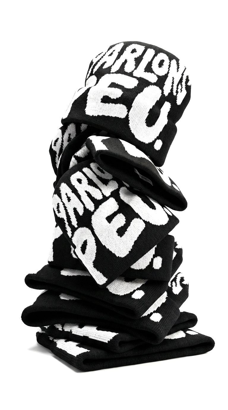 Featuring the signature oversized PARLONS PEU. typography wrapped across the fold, the beanie embodies the brand’s “Members Club Only” identity — confident, minimal, and instantly recognizable.